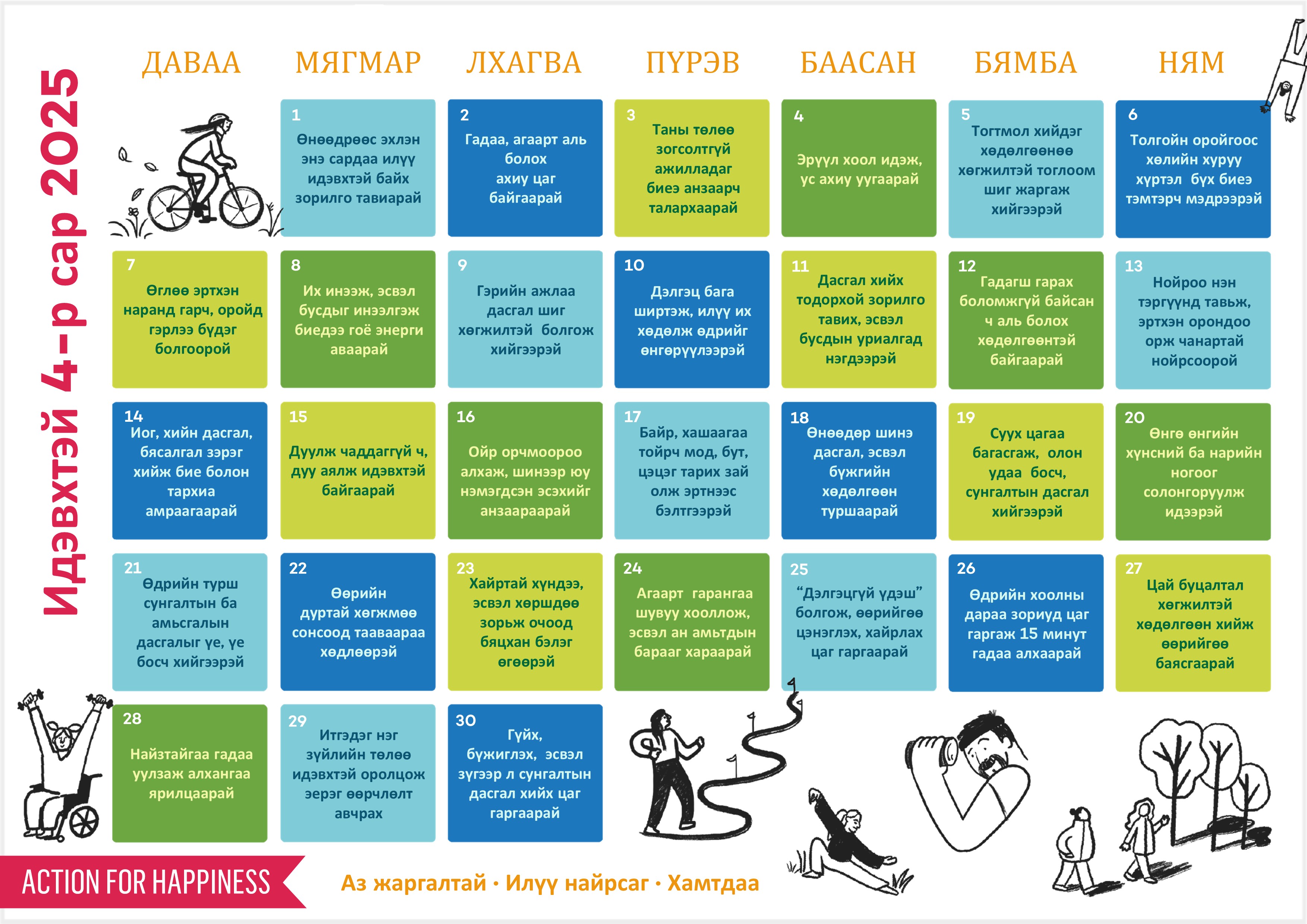 Many thanks also to the generous volunteers who have translated the calendars into other languages, including Lira Sejdini (Albanian), Billy Sisay (Amharic), Hamad Alarafati (Arabic), Leyla Iskandarova (Azerbaijani), Faria Mahbub (Bengali), Stiliyana Stoyanova (Bulgarian), Yun You, Chun Fat Huang & Guan Li Ming (Chinese), Marko Toro (Croatian), Gabriela Macova (Czech), Pia Lihme Petersen (Danish), Martine De Ruiter (Dutch), Siiri Saas (Estonian), Jaione Andueza Intxaurrondo (Euskera), Alice Lehtinen (Finnish), Laurence De Olivera & Cécile Brevet (French), Tobias Polzin, Gunnar Kolley & Rika Tjakea Schütte (German), Ella Movshovitz (Hebrew), GopiKrishan Bali & Arti Kanwar (Hindi), Eva Fekete (Hungarian), Ingibjörg Loftsdóttir & Líney Árnadóttir (Icelandic), Lisa Samadikun (Indonesian), Andrea Magnabosco (Italian), Narumi Isoda (Japanese), Yoonji Kim (Korean), Kai Berdishaliev (Kyrgyz), Eva Viksna (Latvian), Joana Butenaite & Janina Sabaite (Lithuanian), Anastasija Gonchevska (Macedonian), Altanchimeg Delegchoimbol (Mongolian), Helle Marie Ottesen Hammervol (Norwegian), Lidia Golba (Polish), Ernesto Matos, Edson José Cortiano & Heide Castro (Portuguese), Iris Mihaila (Romanian), Sasha Manichenko (Russian), Jennie Duncan (Scottish Gaelic), Marko Toro (Serbian), Eric R. Maunze & Simone (Shona), Katka Makara (Slovak), Ana Resnik (Slovenian), Vicenç Rul.lan & Victòria Picó (Catalan & Spanish), Naima Skillingshage (Swedish), Ali Gülüm, (Turkish), Kate Rudenko & Tetiana Demydko (Ukranian), Chieu Anh Nguyen Hoang (Vietnamese) and David Hughes (Welsh).