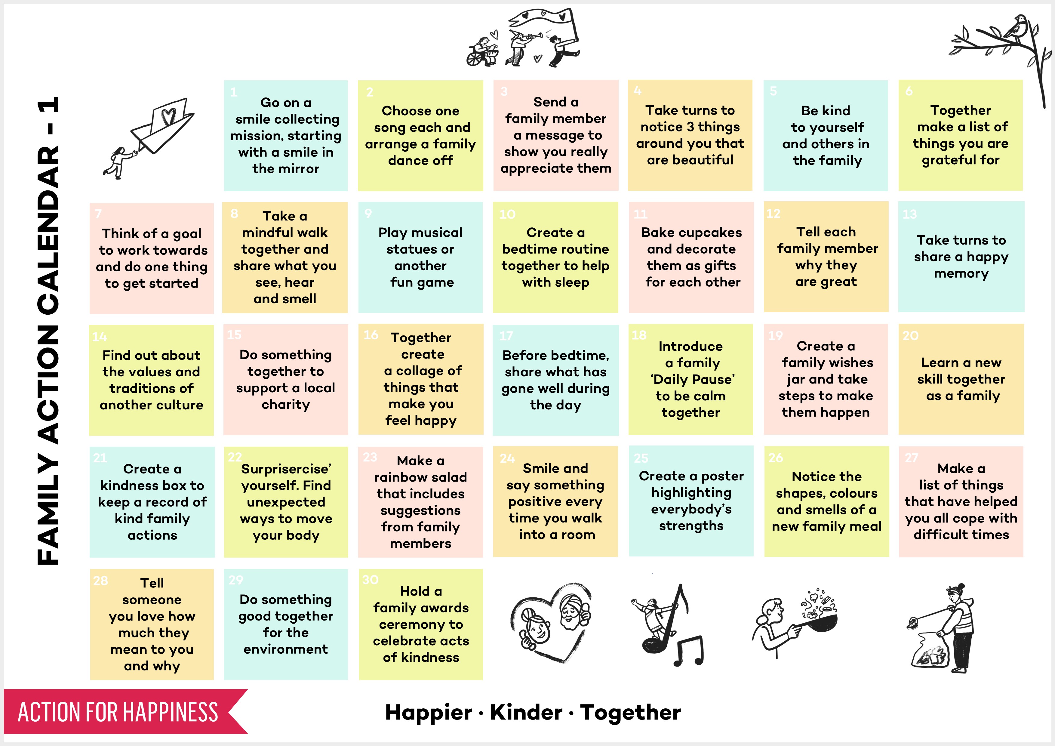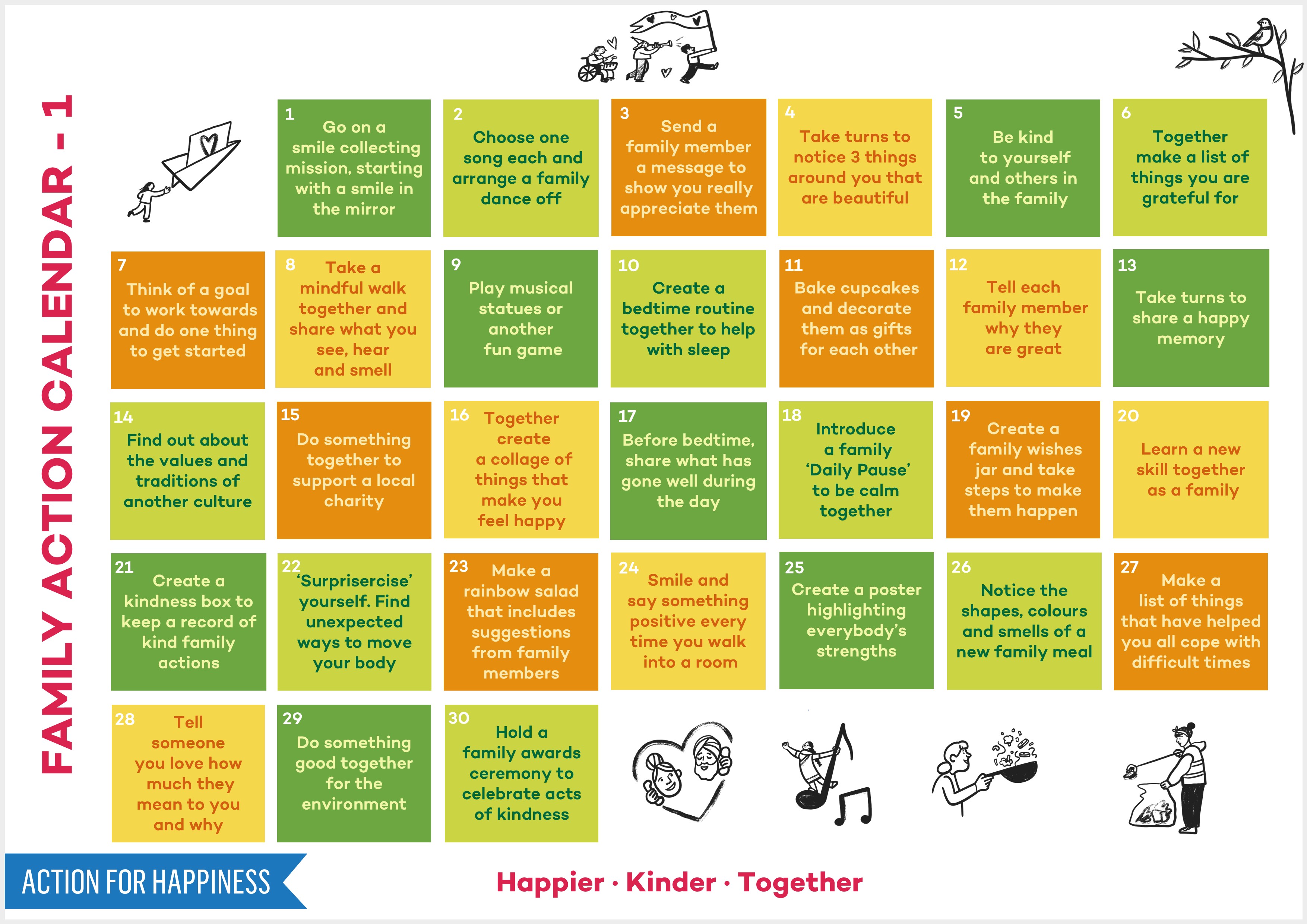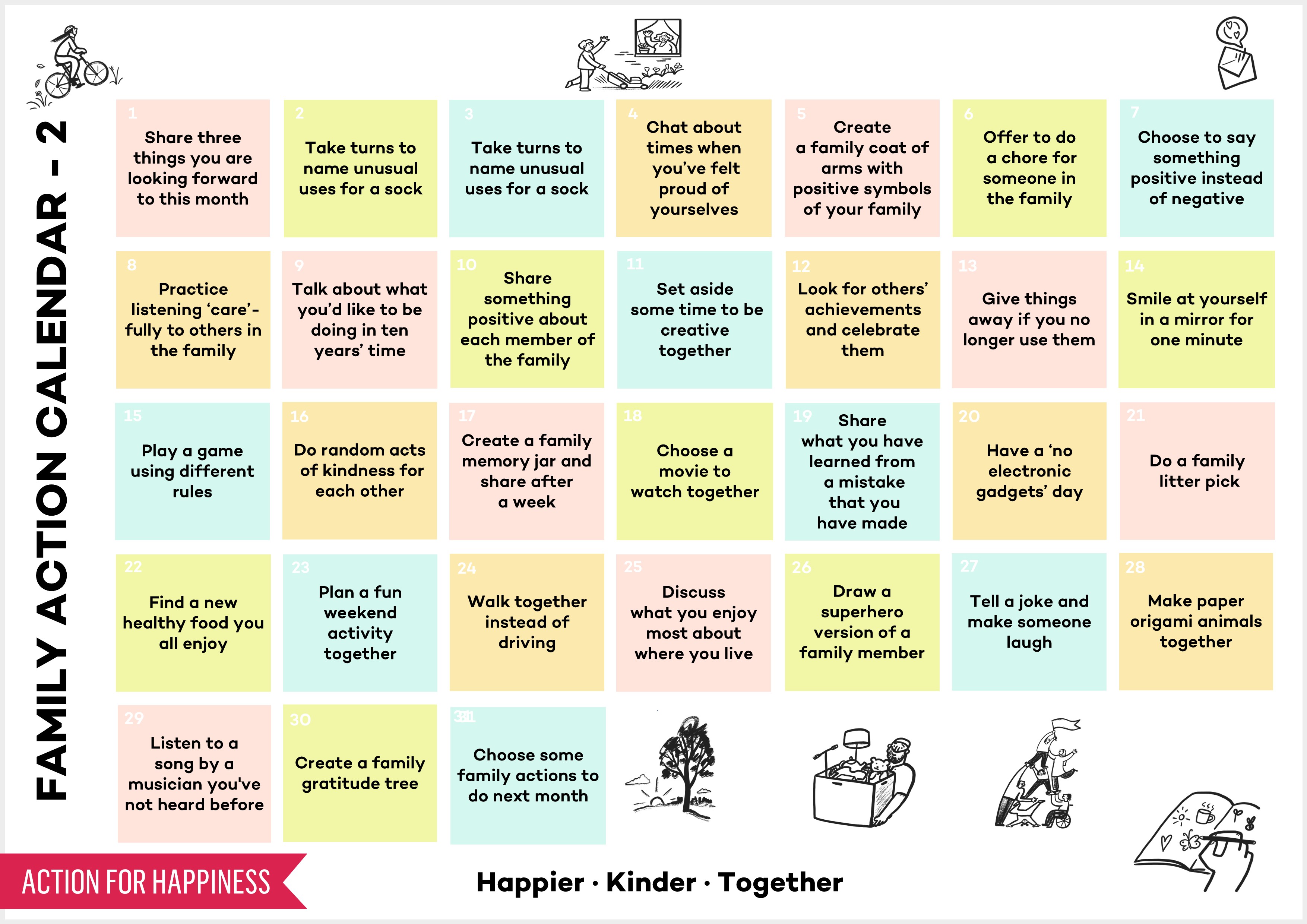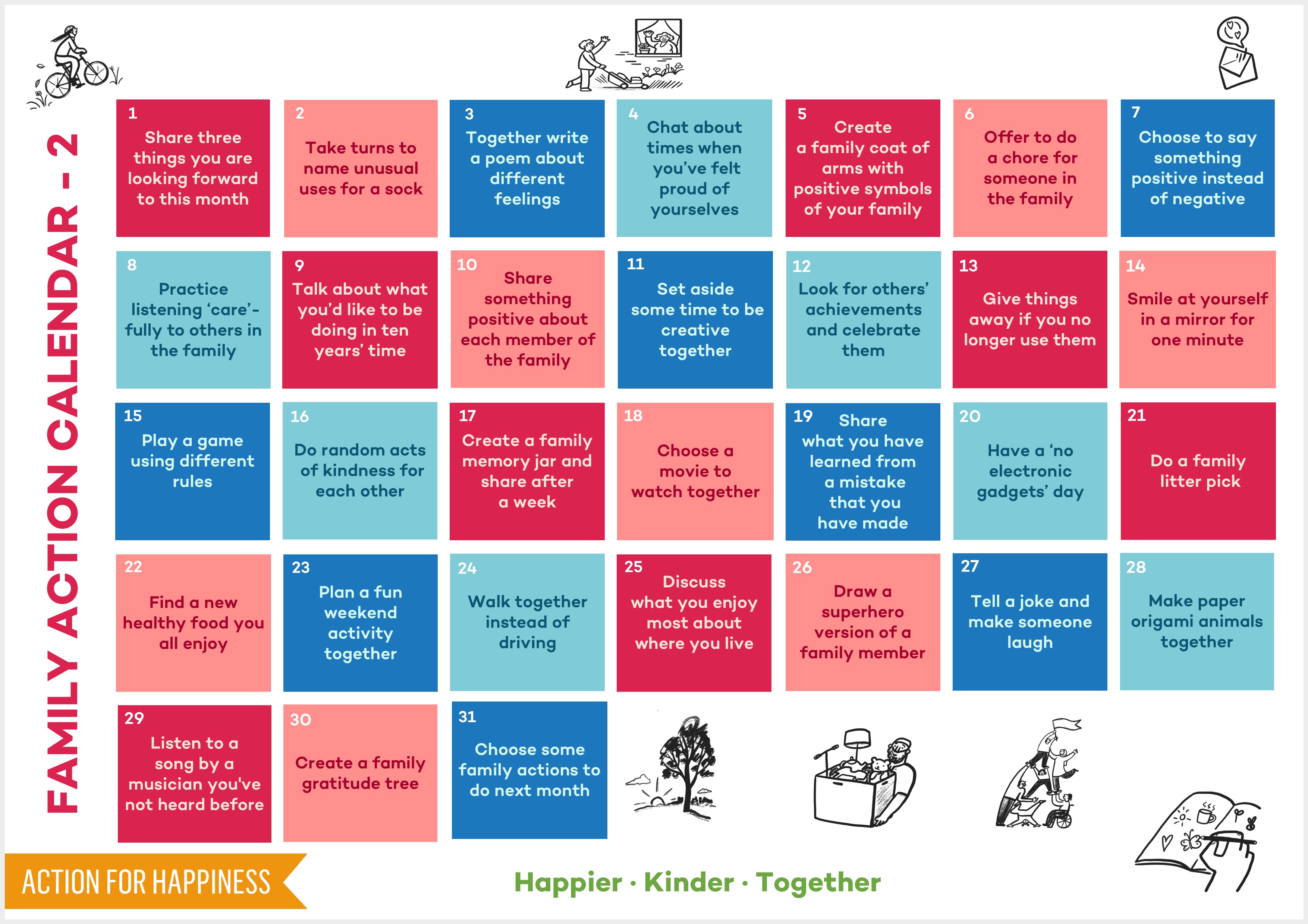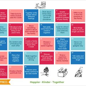 These calendars are for families to share and take action together to feel happier. You can download the calendar as a .jpg image, an accessible image, or as basic text.